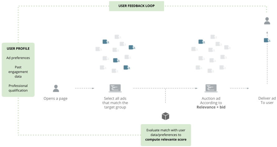 For job ads, for example, a user may opt-in to their profile data that shows their education and professional qualification to be used to show them ads that are more relevant to them. In this case, the “relevance score” that the platform calculates would be an estimate of how likely a user is to qualify for a job based on their background.
