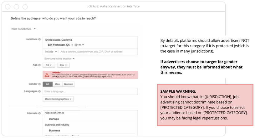 Platforms will provide advertisers an explanation while they select audiences for the ad on the platform. Easily understandable icons will tell advertisers what the audience will be selected based on (see illustration below). Advertisers then confirm if they want to go ahead or change the criteria. This feedback loop will educate advertisers and empower them to make better informed decisions. Legality by default is jurisdiction-specific. Platforms and advertisers alike should be mindful that each country/jurisdiction has specific rules on what is considered discriminatory.