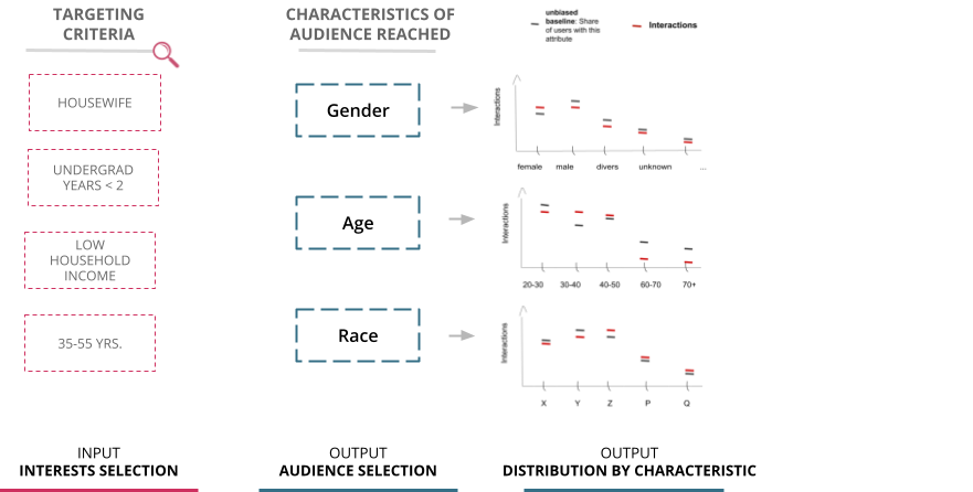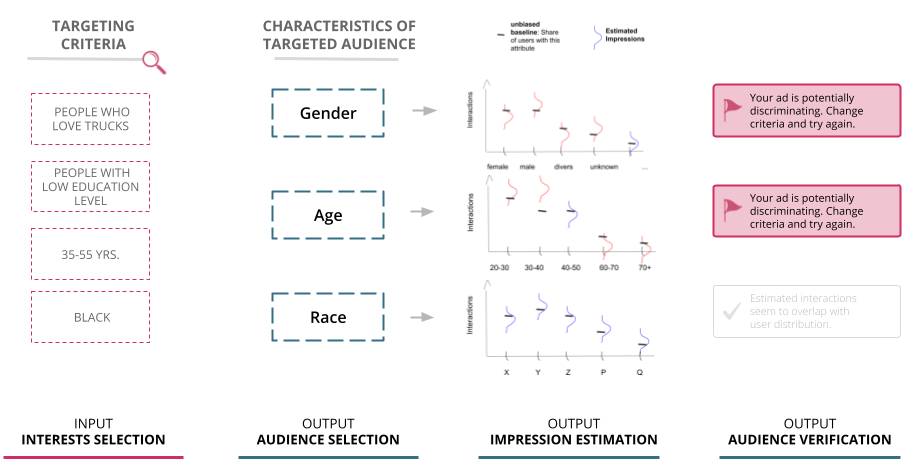 Here advertisers can estimate what effect choosing specific criteria will have on the targeted audience. The information is visualized as distributions over sensitive criteria like gender, age and ethnicity (see illustration below). Estimating a targeting audience is no trivial task because it involves uncertainty about critical variables, e.g. what other ads will be run at the same time. However, for large platforms with a wealth of historical data and sufficient engineering capacity, reaching a satisfactory accuracy should be feasible. Giving advertisers the possibility to detect unwanted skews, biases and discrimination is a prerequisite for holding them accountable and will help define responsibilities between advertisers and platforms.