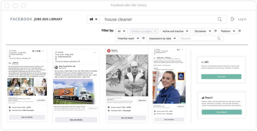 The biggest platforms (e.g. those with > 1 million monthly users), including search, general and professional job platforms, will have to create and regularly update a “job ads” library (see illustration below). This will mitigate the potentially adverse impact of targeted advertising on individuals. Focusing on the biggest platforms ensures that they have the (financial & technical) means to comply with such rules, and does not create market barriers for small and medium platform companies. A few platforms (e.g. Facebook) already have similar mechanisms, enabling both API and interface access for interested parties. Therefore, adding a separate library will be somewhat easier to implement.