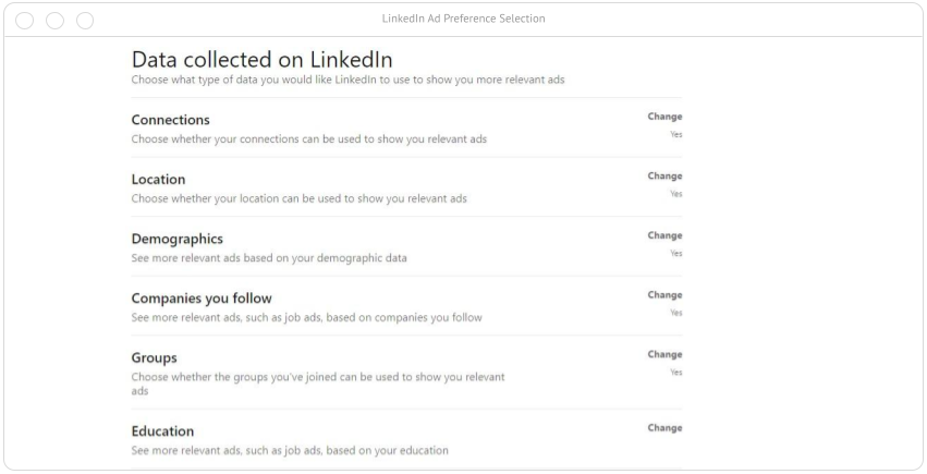 The illustration below shows how LinkedIn, a popular professional networking platform, affords settings for ad preferences.